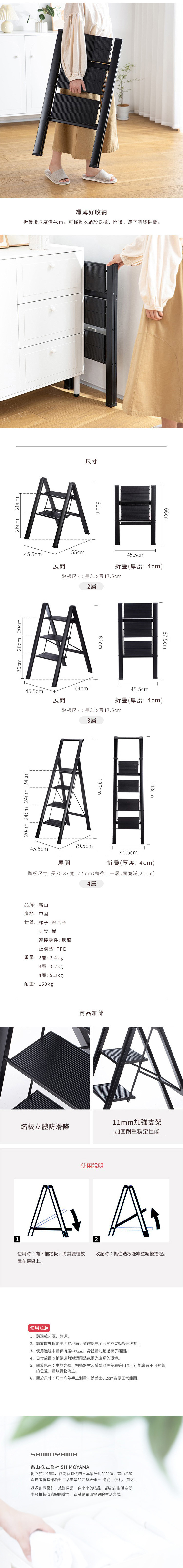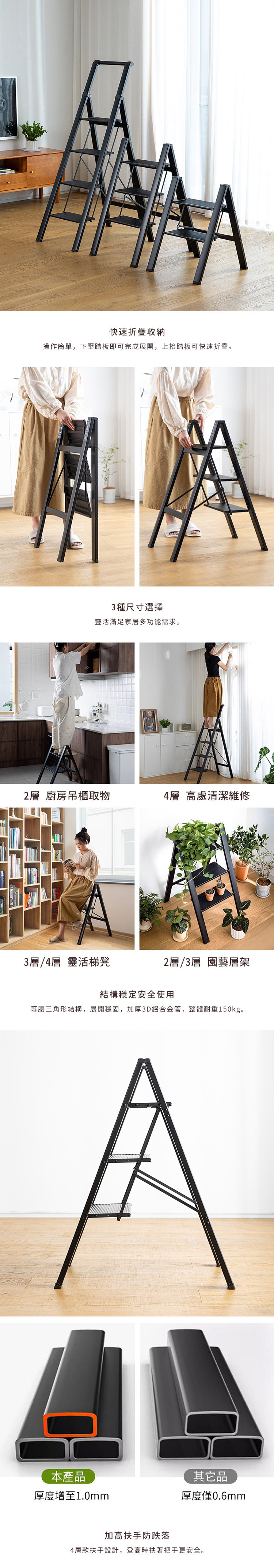 材質:[梯子]鋁合金、[支架]鐵、[連結零件]尼龍、[止滑墊]TPE熱塑性彈性體