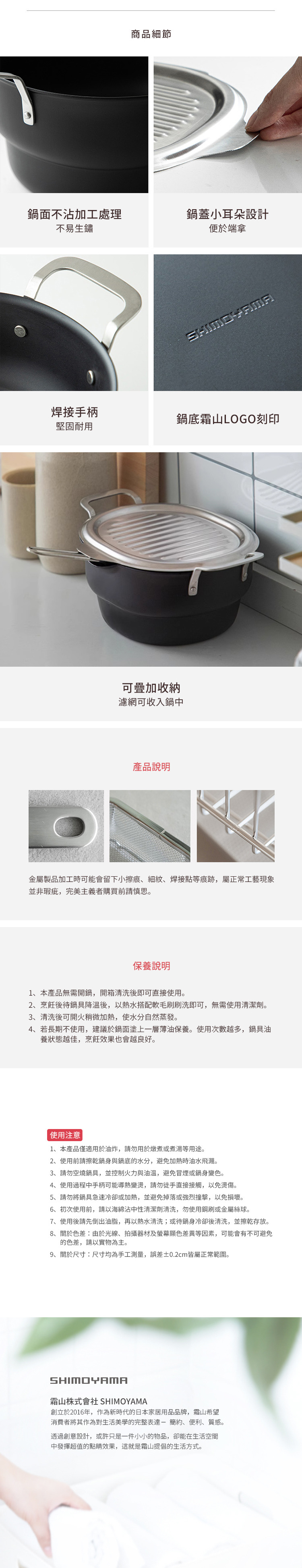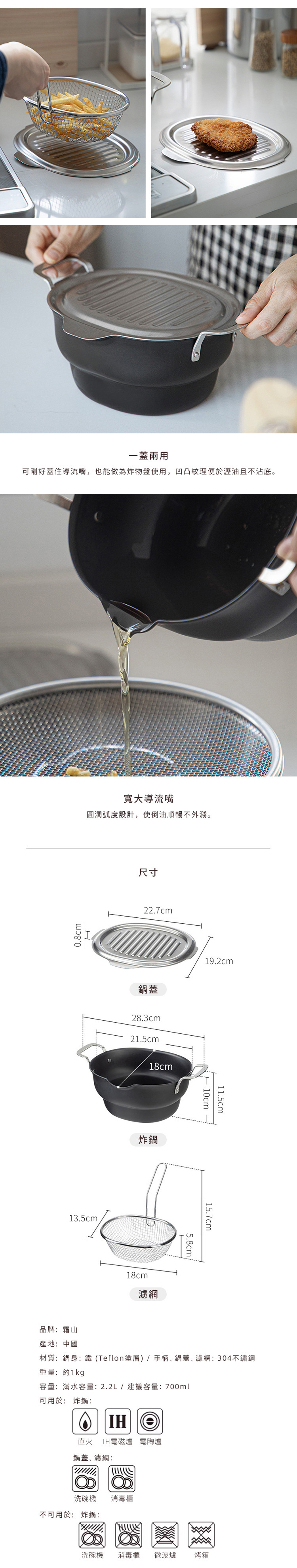 尺寸:[炸鍋]長28.3×寬18×高11.5cm、[鍋蓋]長22.7×寬19.2×高0.8cm、[濾網]長18×寬13.5×高15.7cm