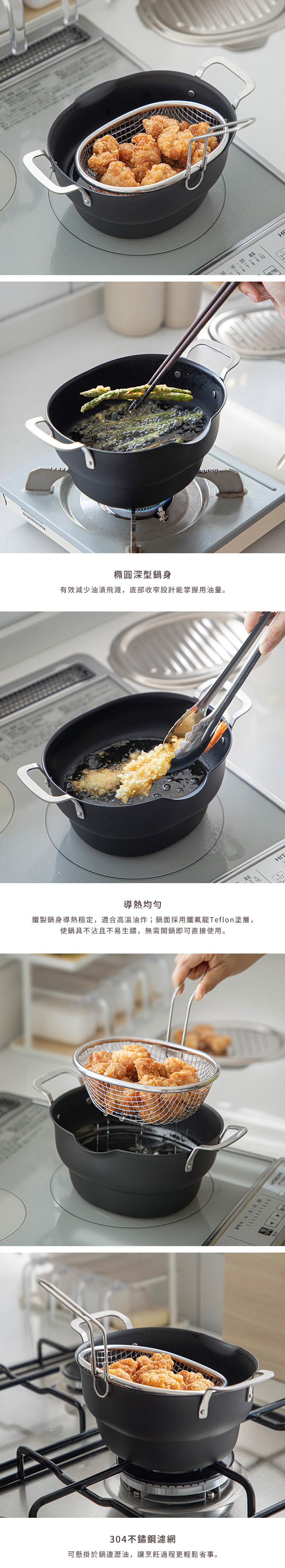 材質:[鍋身]鐵(Teflon塗層)、[手柄、鍋蓋、濾網]304不鏽鋼