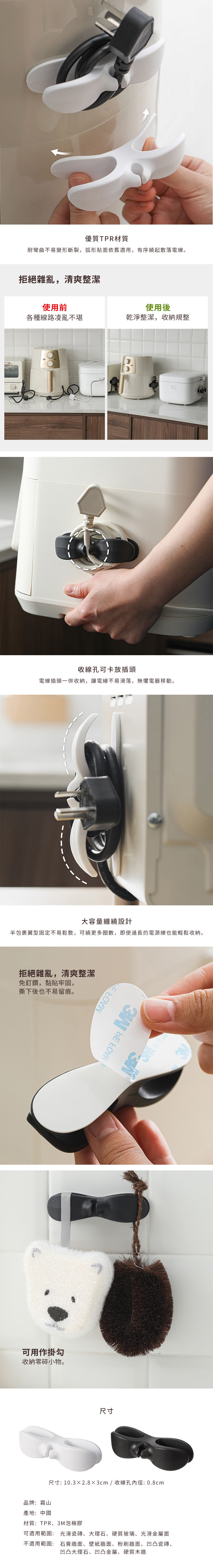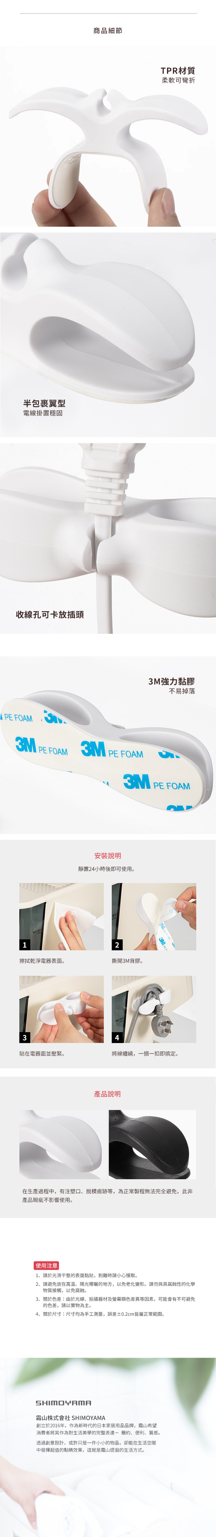 • 【日本霜山】免鑽釘無痕式電線固定收納夾/小物掛勾-3入-多色可選
