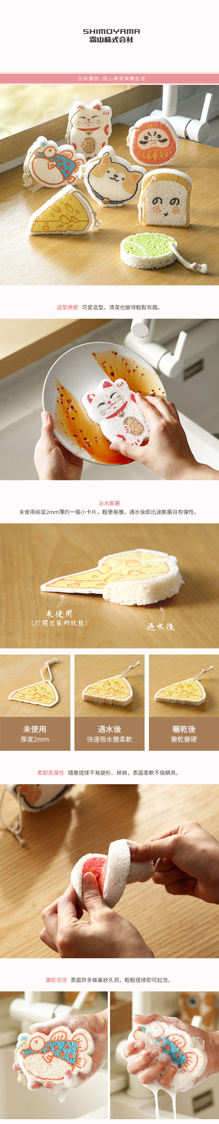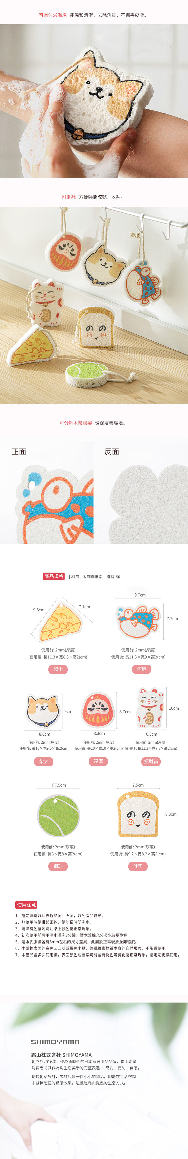 尺寸:[使用前]長8.3×寬7.5×高0.2cm、[使用後]長9.2×寬8.2×高2cm 材質:[海綿]木質纖維素、[掛繩]棉 產地:中國 ※尺寸皆為人工測量,誤差±0.2cm屬正常範圍