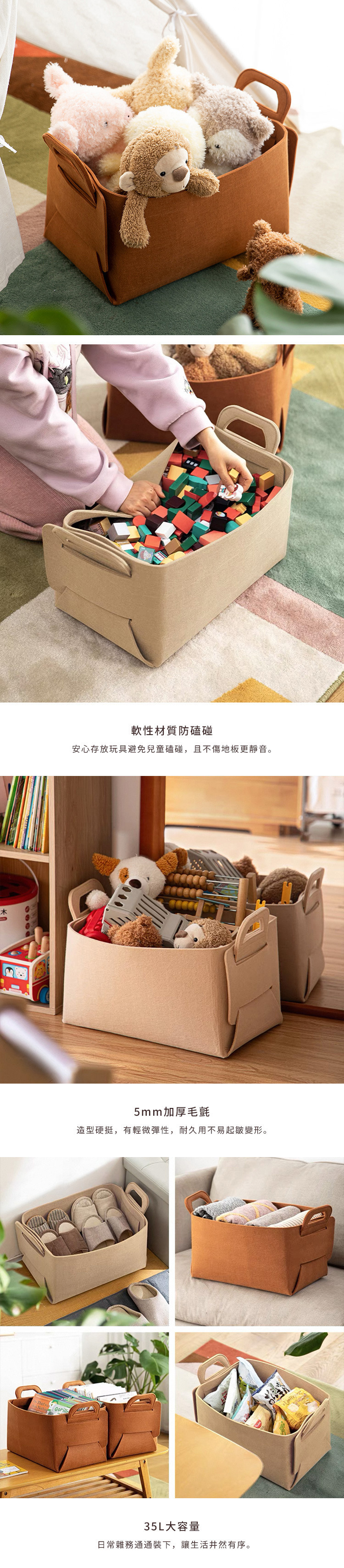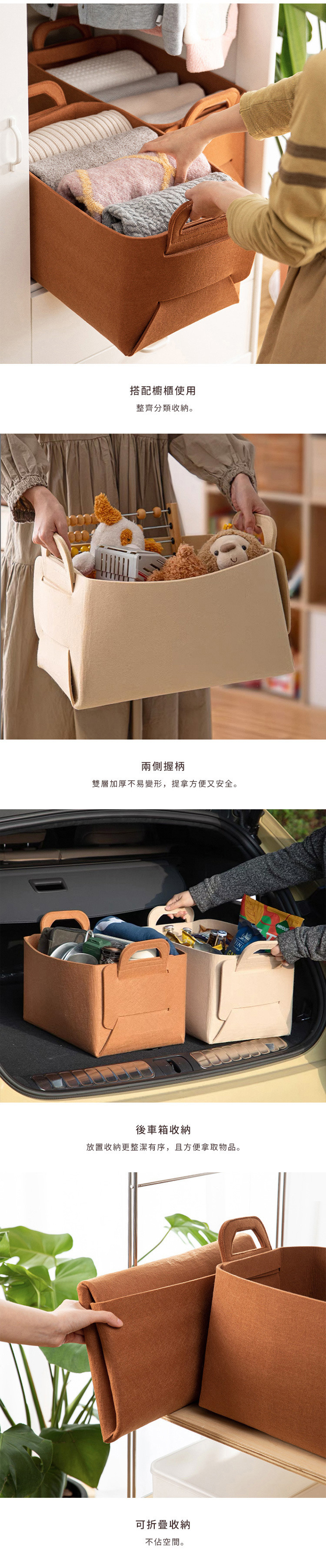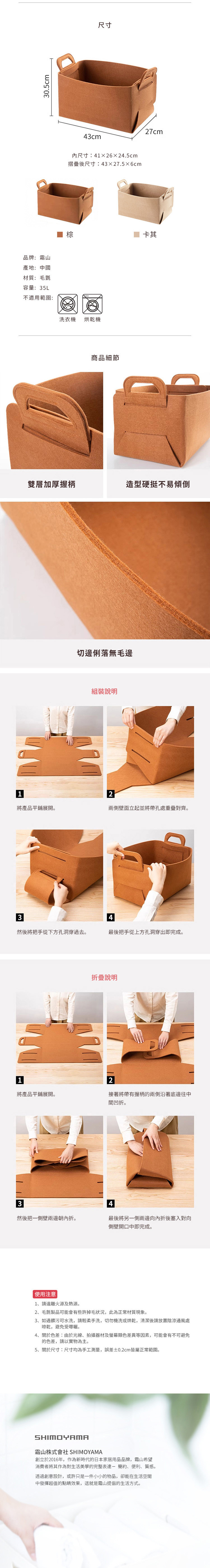尺寸:長43×寬27×高30.5cm、[內徑]長41×寬26×高24.5cm、[摺疊後尺寸]長43×寬27.5×高6cm 材質:毛氈 容量:35L 不適用範圍:洗衣機、烘乾機 產地:中國 ※尺寸皆為人工測量,誤差±0.2cm屬正常範圍。