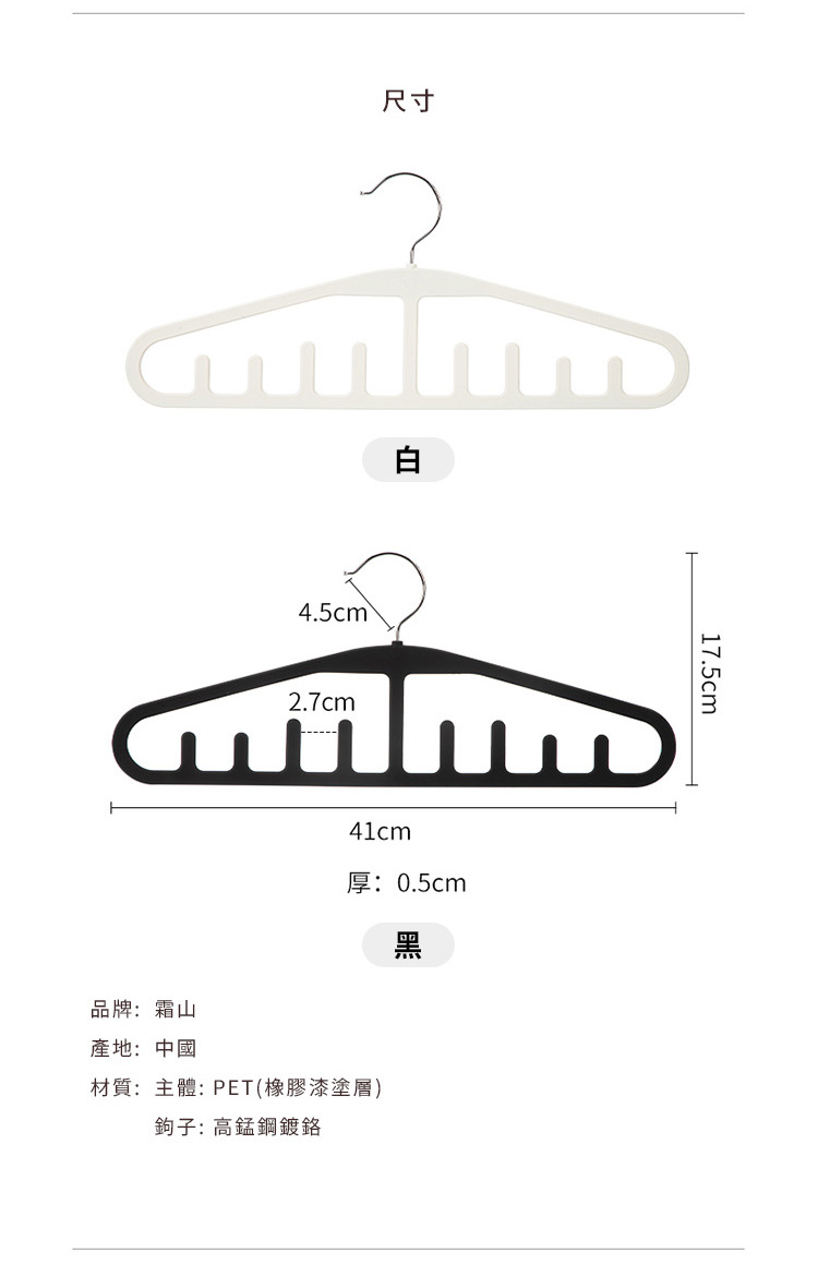 尺寸:[主體]寬41×高17.5×厚0.5cm、掛鉤間距2.7cm 材質:[主體]PET(橡膠漆塗層)、[鉤子]高錳鋼鍍鉻 耐重:整體3kg 產地:中國 ※尺寸皆為人工測量,誤差±0.2cm屬正常範圍。