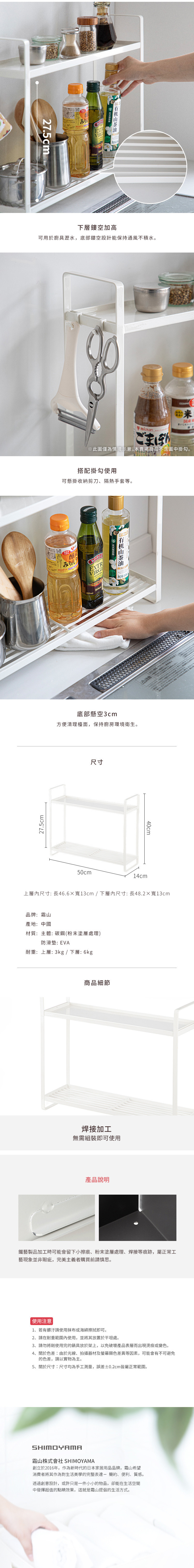 尺寸:長50×寬14×高40cm 材質:[主體]碳鋼(粉末塗層處理)、[防滑墊]EVA 耐重:[上層]3kg、[下層]6kg 產地:中國 ※尺寸皆為人工測量,誤差±0.2cm屬正常範圍。