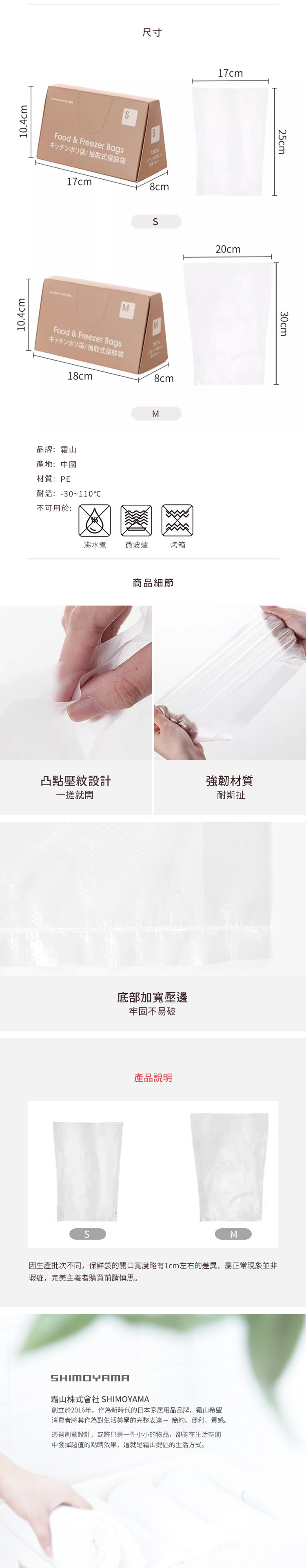 尺寸:[保鮮袋]寬17×高25cm、[外盒]長17×寬8×高10.4cm 材質:聚乙烯 耐溫:-30°C ~ 110°C 不適用於:沸水烹煮、微波爐、烤箱 產地:中國 ※尺寸皆為人工測量,誤差±0.2cm屬正常範圍。