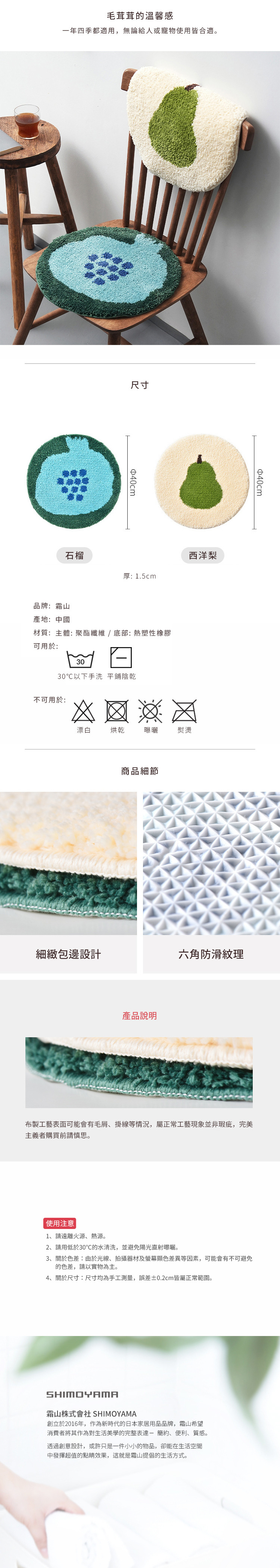 尺寸:[直徑]40cm、[厚度]1.5cm 材質:[主體]聚酯纖維、[底部]熱塑性橡膠 洗滌建議:可30℃以下手洗,不可漂白、烘乾、曝曬、熨燙 產地:中國 ※尺寸皆為人工測量,誤差±0.2cm屬正常範圍。