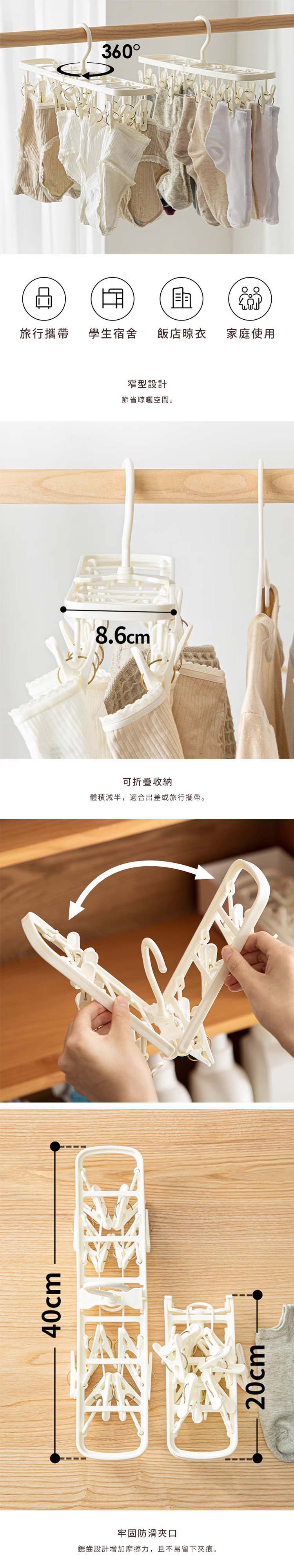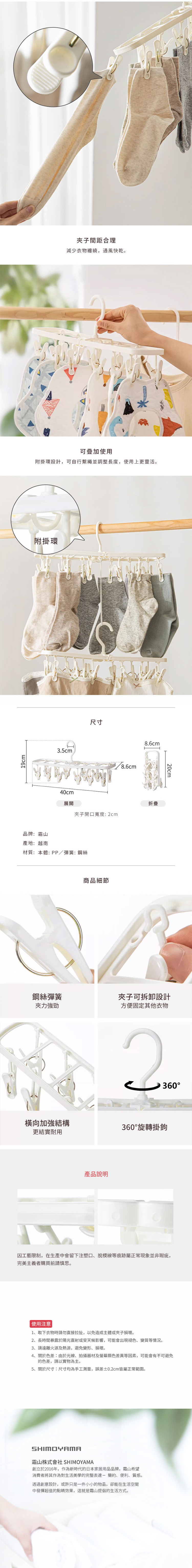尺寸:[展開時]長40×寬8.6×高19cm、[摺疊後]長20×寬8.6cm、[掛勾]寬3.5cm、[夾子開口]寬2cm 材質:[主體]PP、[彈簧]鋼絲 產地:越南 ※尺寸皆為人工測量,誤差±0.2cm屬正常範圍