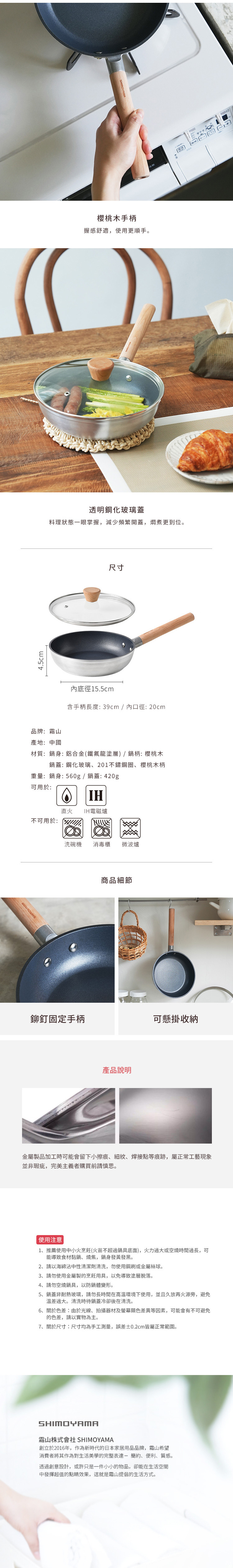 材質:[主體]鋁合金(鐵氟龍塗層)、[手柄]櫻桃木、[鍋蓋]鋼化玻璃、201不鏽鋼、櫻桃木柄