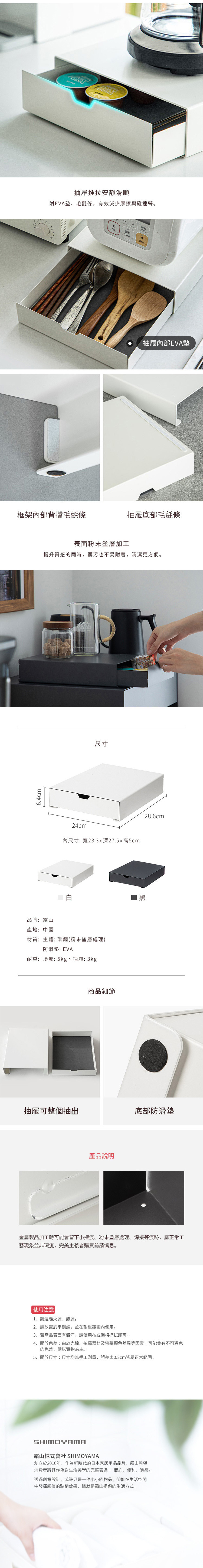 尺寸:寬24×深28.6×高6.4cm、[內尺寸]寬23.3×深27.5×高5cm 材質:[主體]碳鋼(粉末塗層處理)、[防滑墊]EVA 耐重:[頂部]5kg、[抽屜]3kg 產地:中國 ※尺寸皆為人工測量,誤差±0.2cm屬正常範圍。