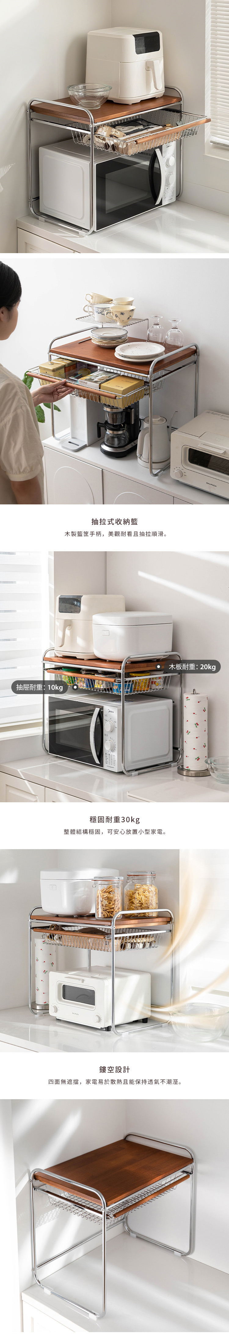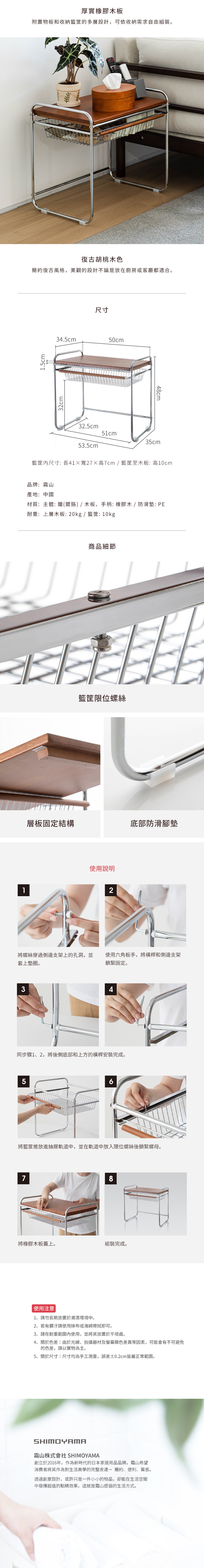 尺寸:寬53.5×深35×高48cm、[籃框內尺寸]寬41×深27×高7cm 材質:[主體]鐵(鍍鉻)、[木板/手柄]橡膠木、[防滑墊]PE 耐重:[上層木板]20kg、[籃筐]10kg 產地:中國 ※尺寸皆為人工測量,誤差±0.2cm屬正常範圍。