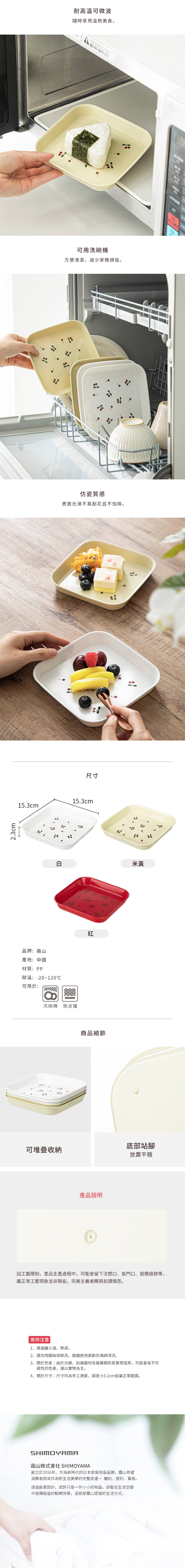 尺寸:長15.3×寬15.3×高2.3cm 材質:PP 耐溫:-20℃~120℃ 適用於:洗碗機、微波爐 產地:中國 ※尺寸皆為人工測量,誤差±0.2cm屬正常範圍。