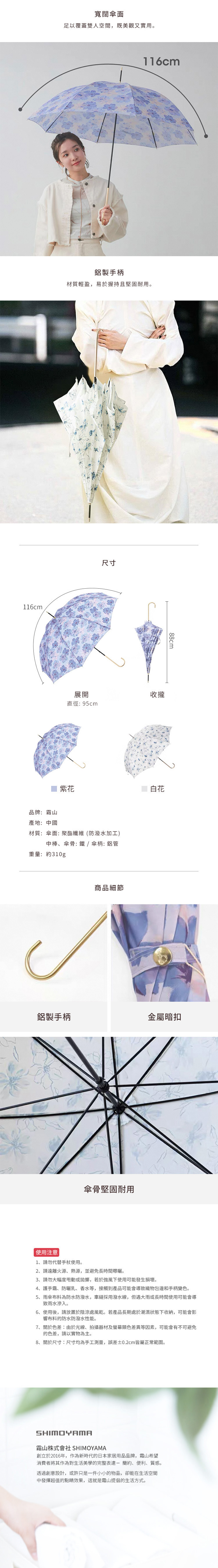 尺寸:[展開直徑]95cm、[收攏高度]88cm 材質:[傘面]聚酯纖維(防潑水加工)、[中棒、傘骨]鐵、[傘柄]鋁管 重量:約310g 產地:中國 ※尺寸皆為人工測量,誤差±0.2cm屬正常範圍。