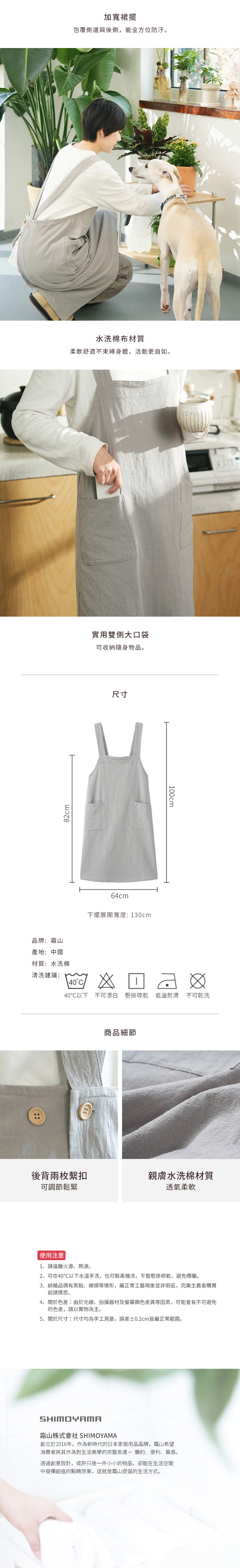 尺寸:長100×寬64cm、[下擺展開寬度]130cm 材質:水洗棉 適用於:水溫40℃以下清洗、懸掛晾乾、低溫熨燙 不適用於:漂白、乾洗 產地:中國 ※尺寸皆為人工測量,誤差±0.2cm屬正常範圍。