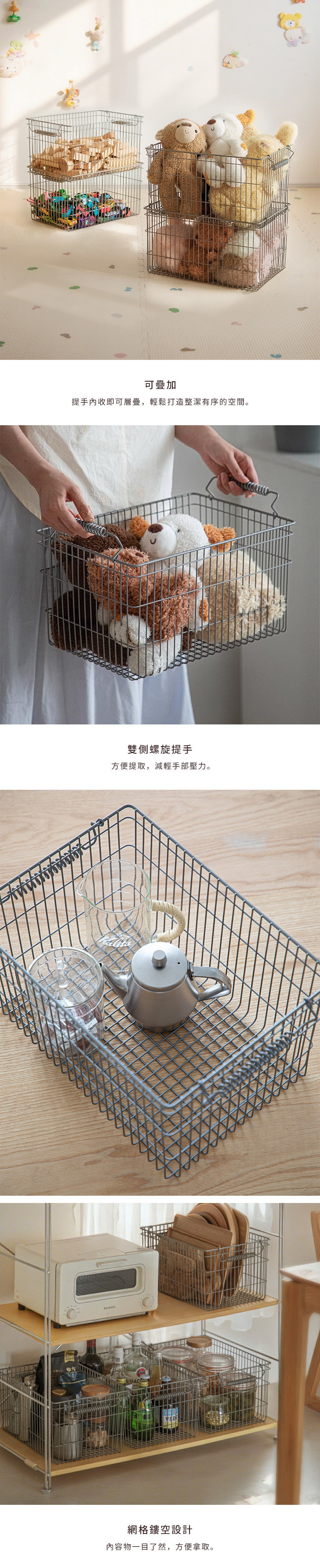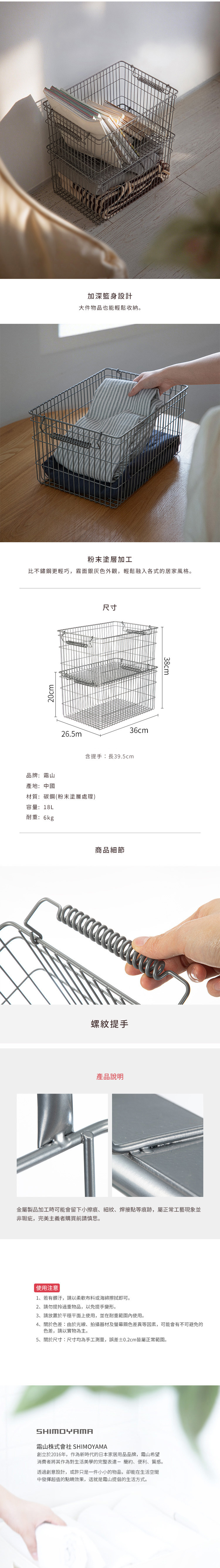 尺寸:長36×寬26.5×高20cm、[含提手]長39.5cm 材質:碳鋼(粉末塗層處理) 耐重:6kg 容量:18L 產地:中國 ※尺寸皆為人工測量,誤差±0.2cm屬正常範圍。