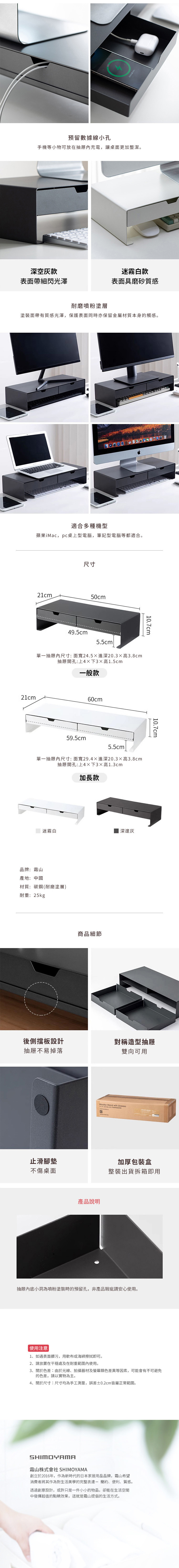 尺寸:長50×寬21×高10.7cm、[抽屜]長24.5×寬20.3×高3.8cm、[抽屜開孔]上4×下3×高1.5cm 材質:碳鋼(耐磨塗層) 耐重:25kg 產地:中國 ※尺寸皆為人工測量,誤差±0.2cm屬正常範圍