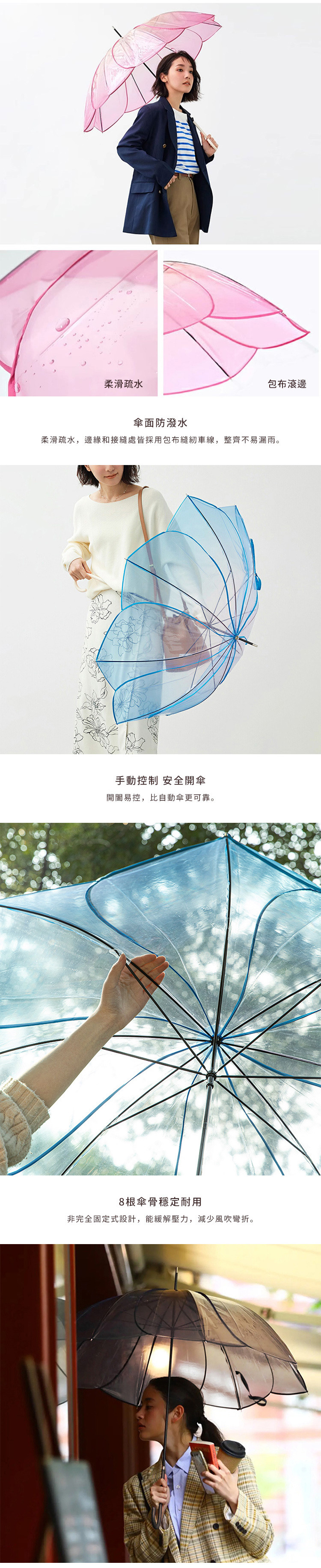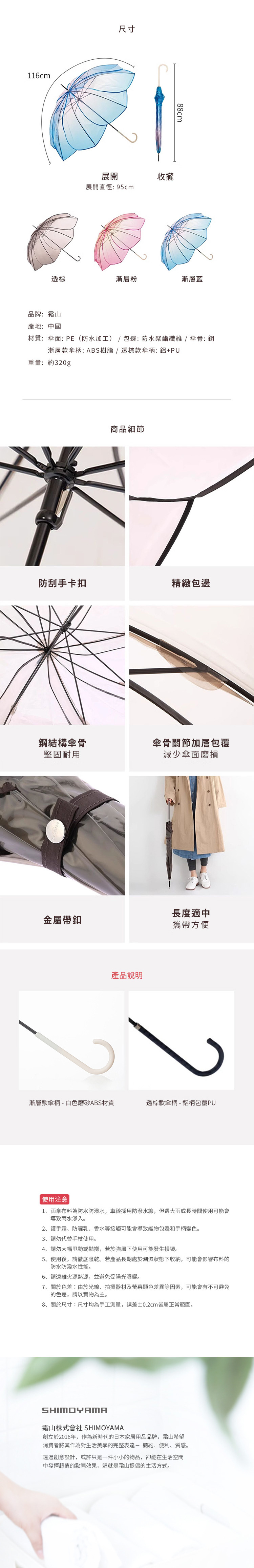 尺寸:[展開直徑]95cm、[收攏高度]88cm 材質:[傘面]PE(防水加工)、[包邊]防水聚酯纖維、[傘骨]鋼、[傘柄]漸層款-ABS樹脂 / 透明棕-鋁+PU 重量:約320g 產地:中國 ※尺寸皆為人工測量,誤差±0.2cm屬正常範圍。