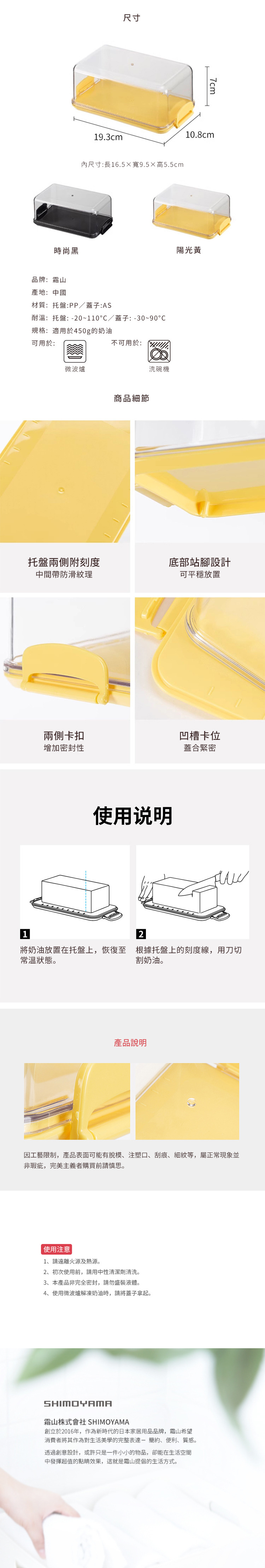 尺寸:長19.3×寬10.8×高7cm 材質:[托盤]PP、[蓋子]AS 耐溫:[托盤]-20~110℃、[蓋子]-30~90℃ 適用於:450g的奶油 產地:中國 可用於:微波爐 不可用於:洗碗機 ※尺寸皆為人工測量,誤差±0.2cm屬正常範圍