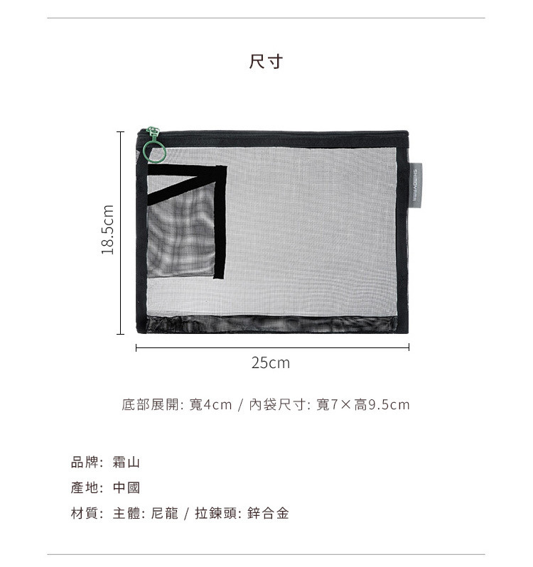 尺寸:寬25×高18.5cm、[底部展開]寬4cm、[內袋]寬7×高9.5cm 材質:[主體]尼龍、[拉鍊頭]鋅合金 產地:中國 ※尺寸皆為人工測量,誤差±0.2cm屬正常範圍。