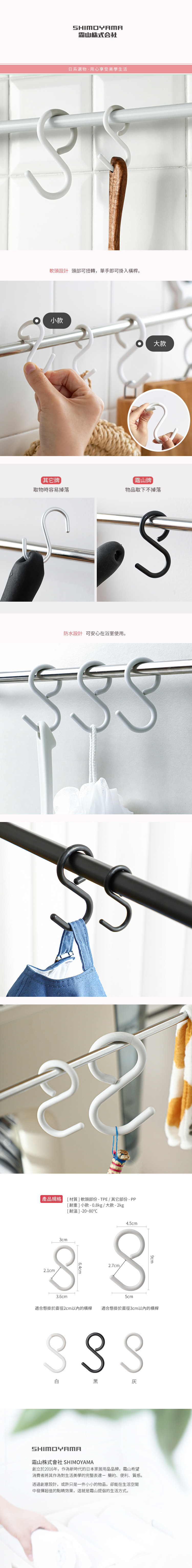 尺寸:(約)長3x寬3.6x高6.4cm 材質:[軟頭部份]TPE、[其它部份]PP 耐溫:[TPE] -20°C~80°C、[PP] -20°C~90°C 適用:直徑2cm以內橫桿 耐重:800g 產地:中國 ※尺寸皆為人工測量,誤差±2cm屬正常範圍
