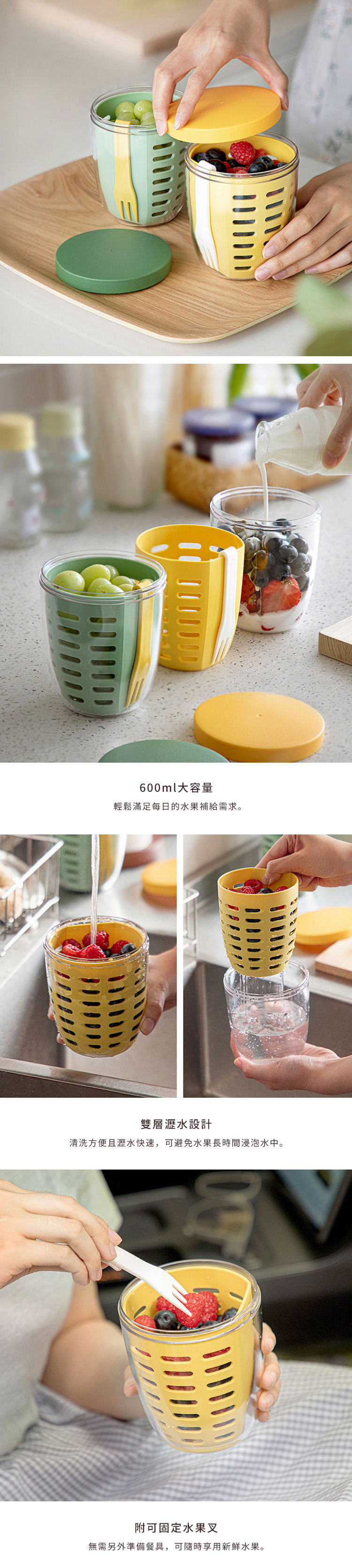 • 【日本霜山】雙層瀝水密封保鮮杯/水果沙拉杯(附叉子)-600ml-多色可選