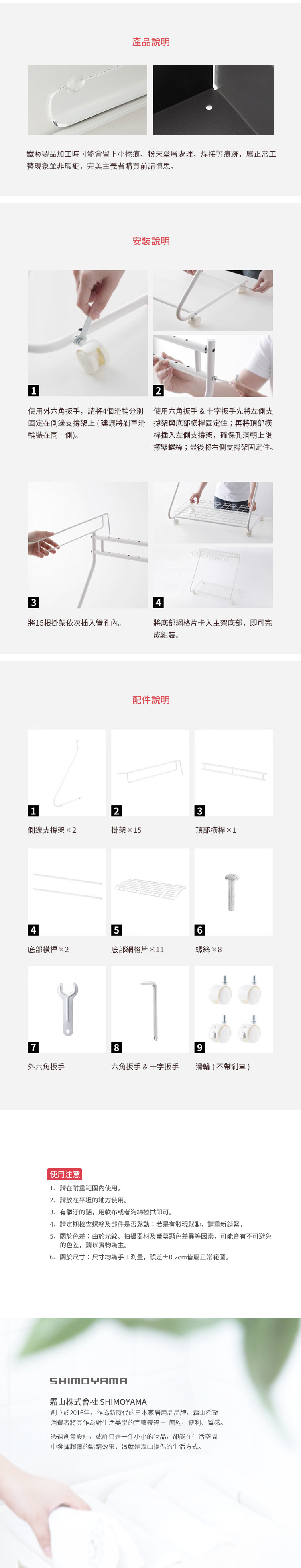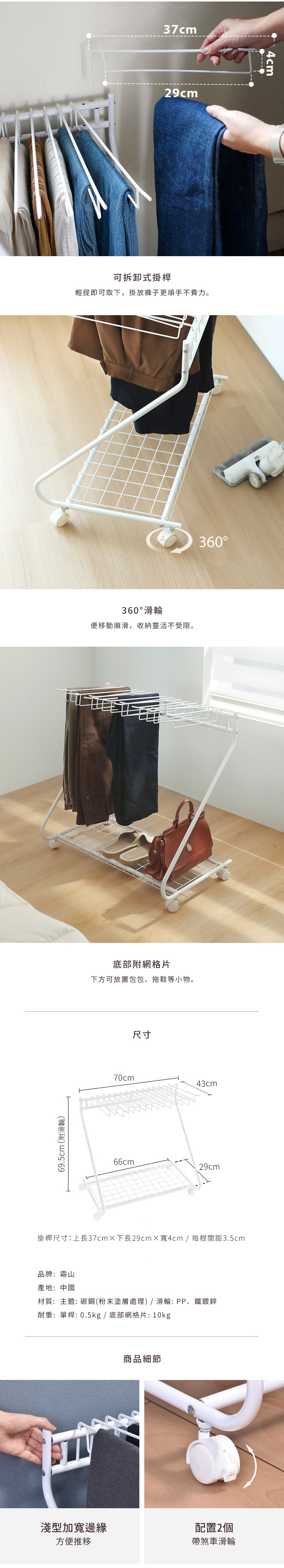 尺寸:長70×寬43×高(含滾輪)69.5cm、[下層網格]長66×寬29cm 材質:[主體]碳鋼(粉末塗層處理)、[滾輪]PP、鐵鍍鋅 耐重:[掛桿]0.5kg、[下層網格]10kg 產地:中國 ※尺寸皆為人工測量,誤差±0.2cm屬正常範圍。