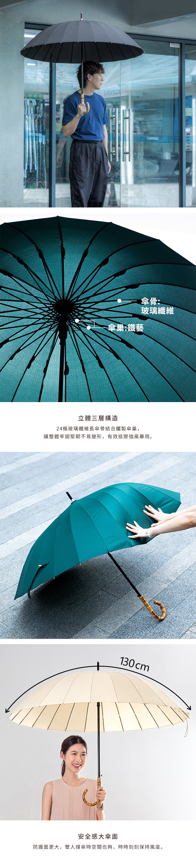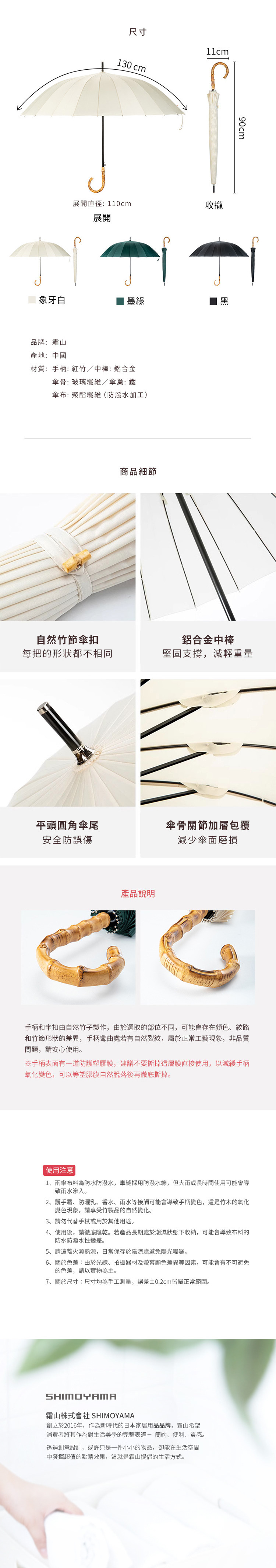 材質:[手柄]紅竹、[中棒]鋁合金、[傘骨]玻璃纖維、[傘巢]鐵、[傘布]聚酯纖維(防潑水加工)