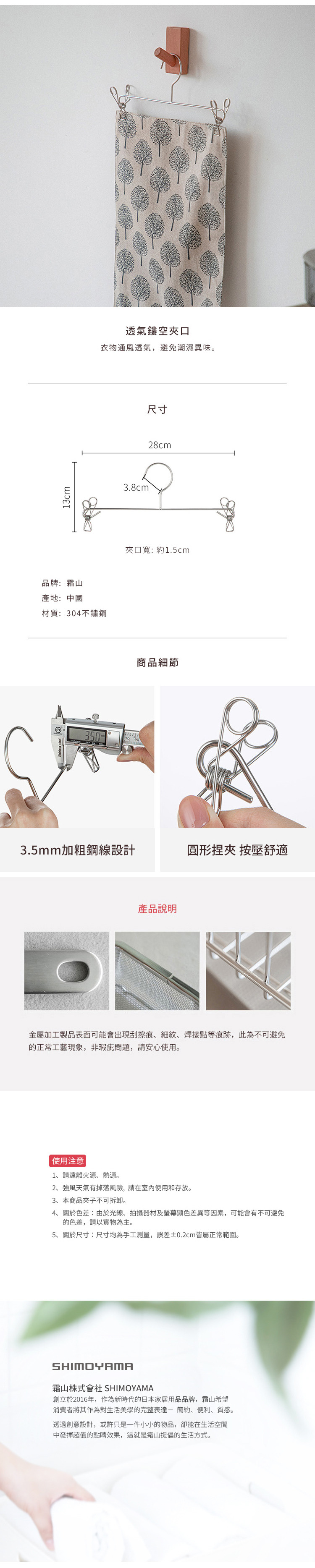 尺寸:長28×寬13cm、[掛勾]寬3.8cm、[夾口]寬約1.5cm 材質:304不鏽鋼 產地:中國 ※尺寸皆為人工測量,誤差±0.2cm屬正常範圍。