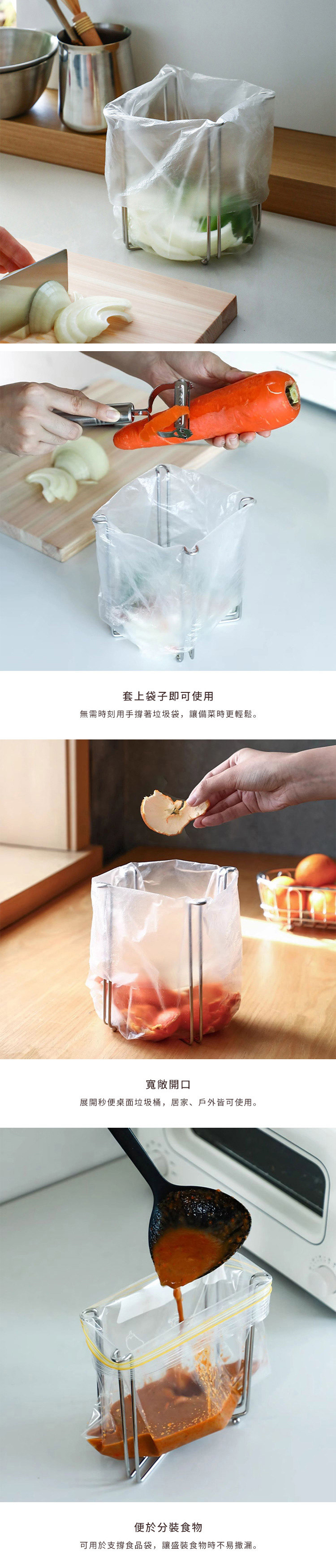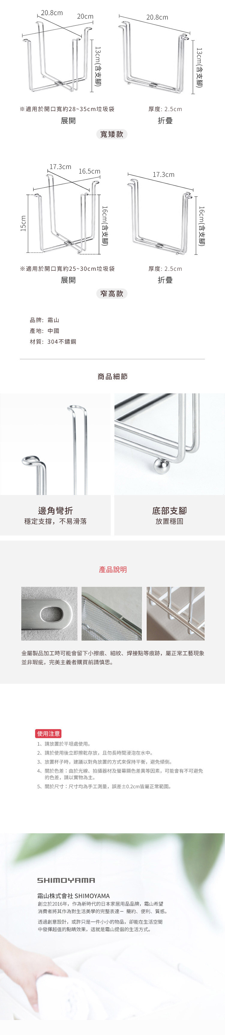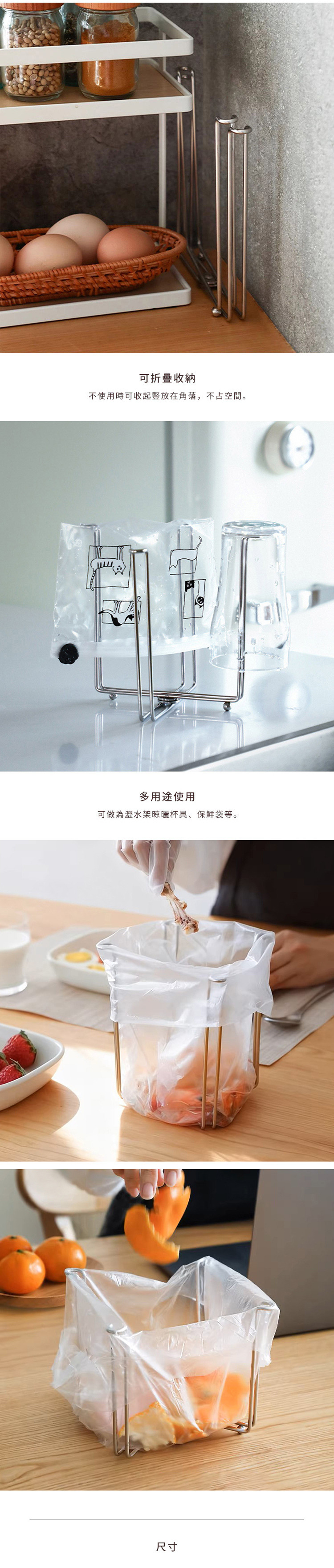 尺寸:[展開]長20.8×寬20×高(含支腳)13cm、[折疊]長20.8×高(含支腳)13cm、[折疊厚度]2.5cm 材質:304不鏽鋼 適用於:開口寬約28~35cm塑膠袋 產地:中國 ※尺寸皆為人工測量,誤差±0.2cm屬正常範圍。