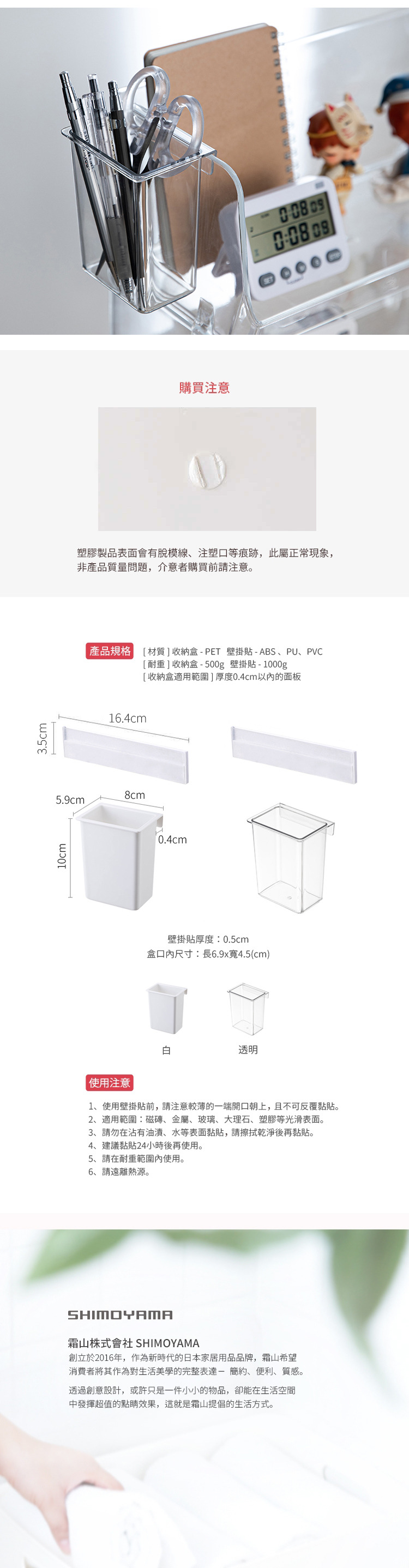 適用範圍:[收納盒]厚度0.4cm以內的面板、[壁掛貼]磁磚、金屬、玻璃、大理石、塑膠等光滑表面
