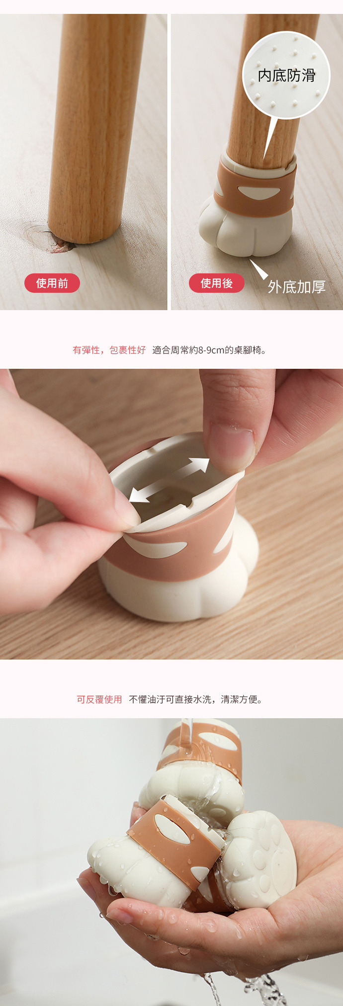 尺寸:(約)直徑2.9x寬4.5x高4.3cm 材質:矽膠 適用:周長約8-9cm桌椅腳 產地:中國 ※尺寸皆為人工測量,誤差±2cm屬正常範圍