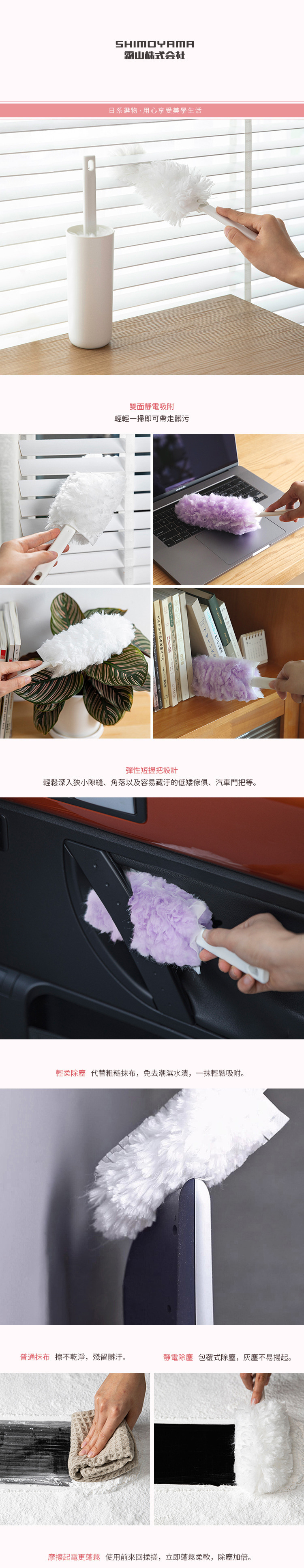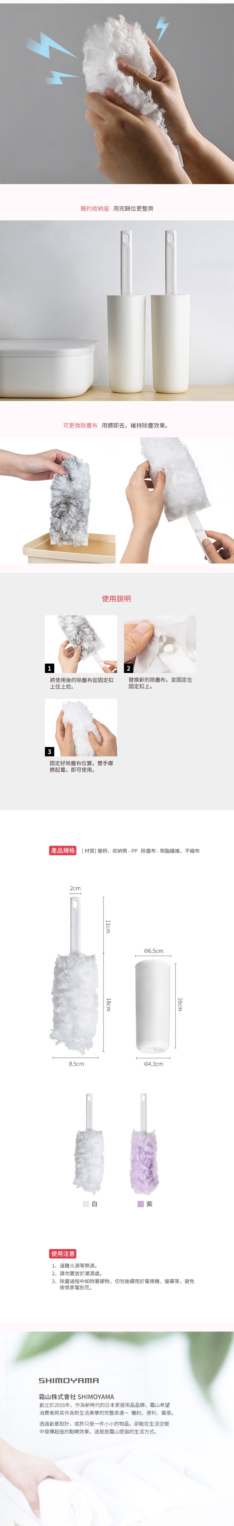 材質:[握柄]PP、[除塵布] 聚酯纖維、不織布、[收納筒]PP 尺寸:[除塵撢]長29x寬8.5cm(包含握把)、[收納筒]寬6.5x高16cm 產地:中國 ※尺寸皆為人工測量,誤差±0.2cm屬正常範圍