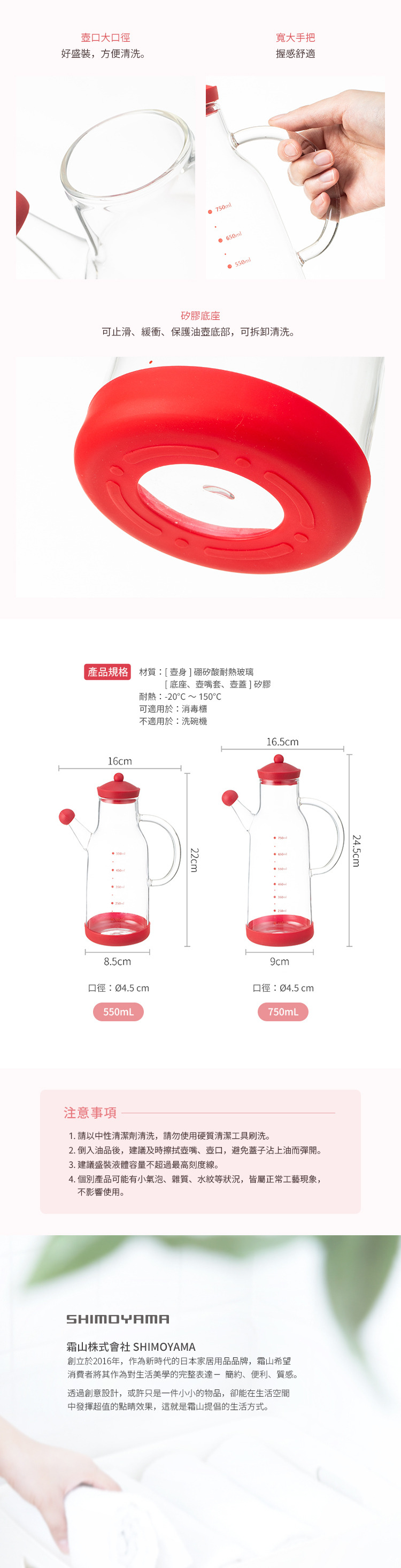 尺寸:寬8.5x高22cm(口徑:4.5cm) 材質:[壺身]硼矽酸耐熱玻璃、[底座、壺嘴套、壺蓋]矽膠 耐溫:-20~150°C 可適用:消毒櫃 不適用:洗碗機 產地:中國 ※尺寸皆為人工測量,誤差±0.2cm屬正常範圍