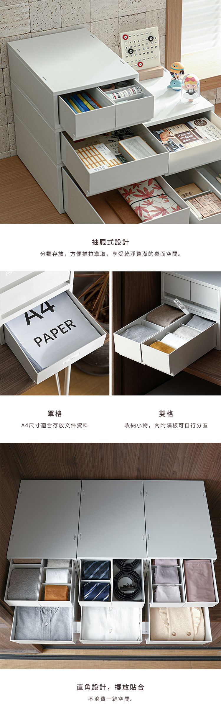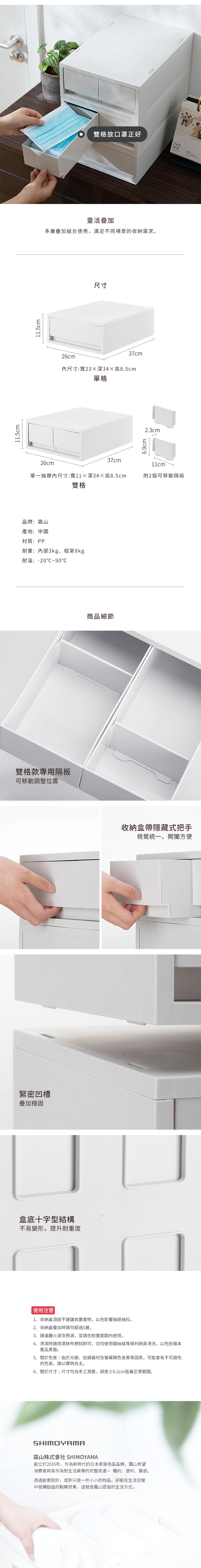 尺寸:寬26×深37×高11.5cm、[單格款內徑]寬23×深34×高8.5cm、[雙格款單一抽屜內徑]寬11×深34×高8.5cm