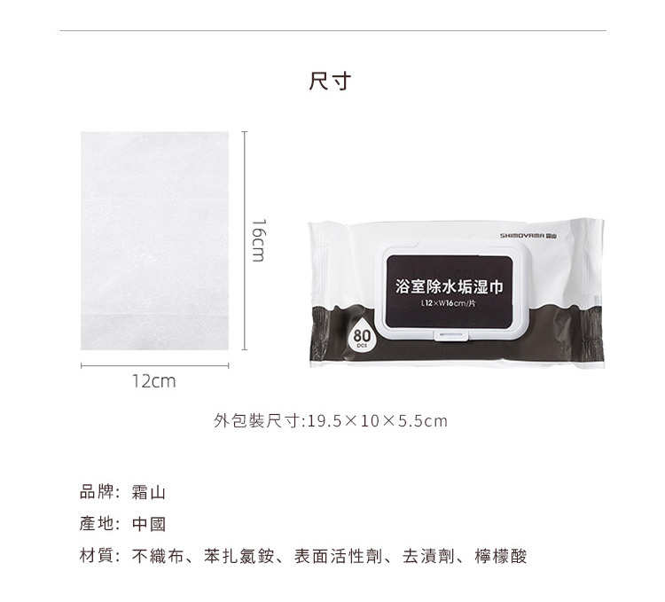 包裝尺寸:長5.5x寬3.5x高10.5cm 單張尺寸:長16x12cm 材質:不織布 成分:苯扎氯銨、表面活性劑、去漬劑、檸檬酸 產地:中國 ※尺寸皆為人工測量,誤差±0.2cm屬正常範圍