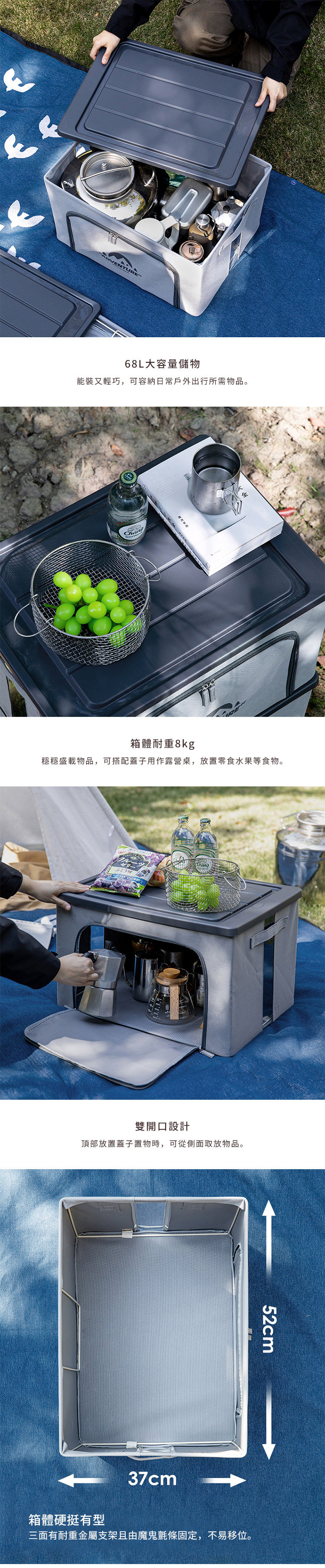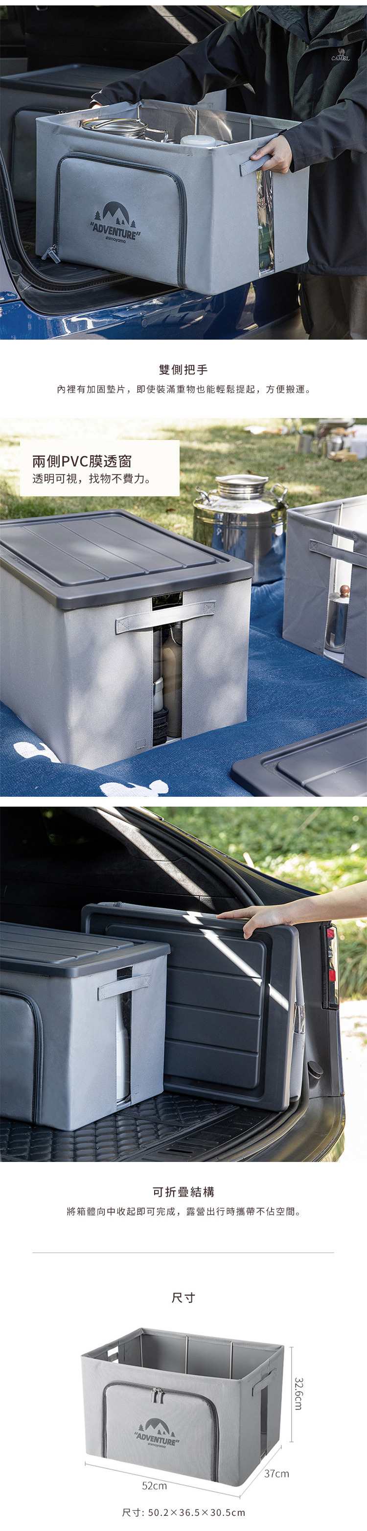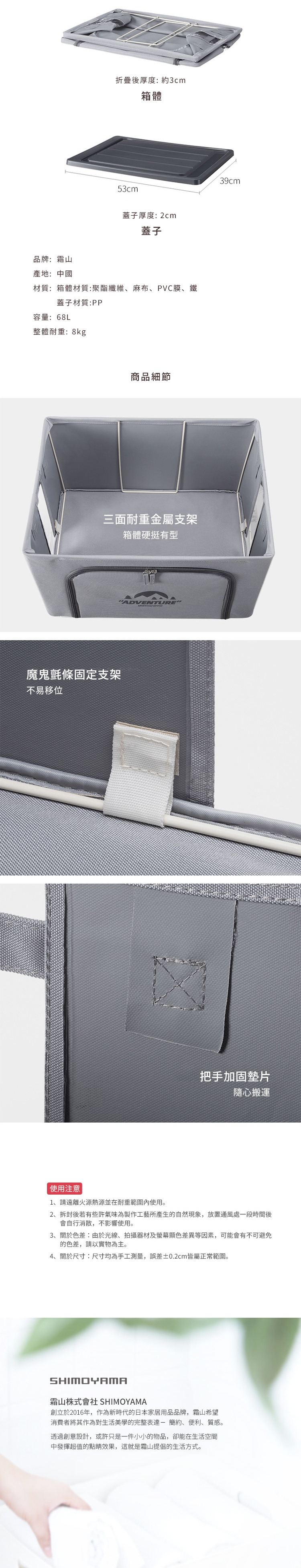 尺寸:[箱體]長52×寬37×高32.6cm、[盒蓋]長53×寬39×高2cm、[折疊]3cm 材質:[箱體]聚酯纖維、麻布、PVC膜、鐵;[盒蓋]PP 容量:68L 耐重:8kg 產地:中國 ※尺寸皆為人工測量,誤差±0.2cm屬正常範圍。