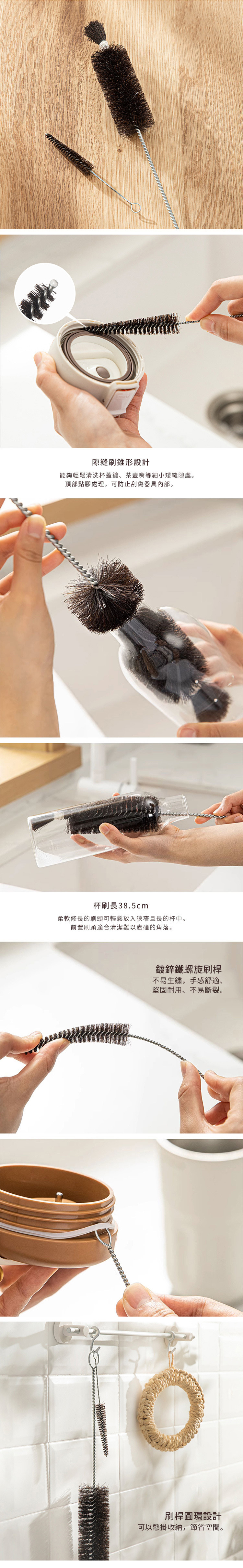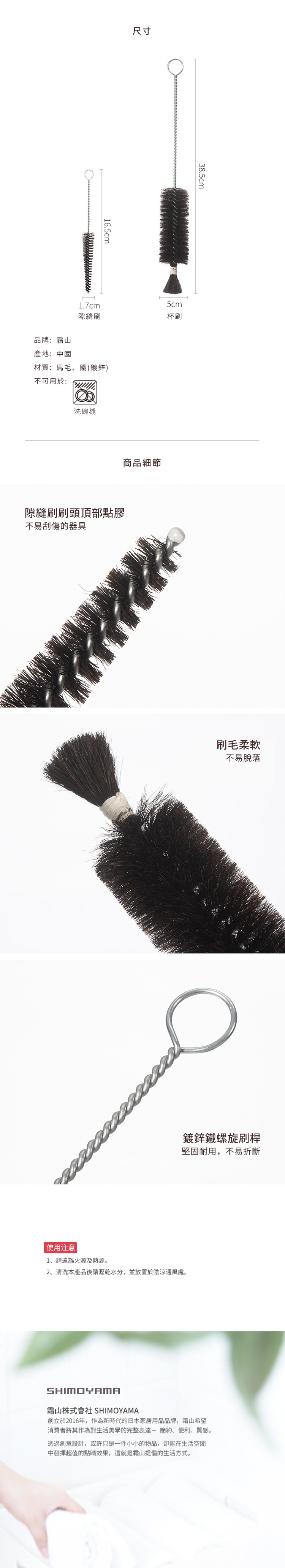 尺寸:[隙縫刷]長16.5x寬1.7cm、[杯刷]長38.5x寬5cm 材質:馬毛、鐵(鍍鋅) 產地:中國 不可用於:洗碗機 ※尺寸皆為人工測量,誤差±0.2cm屬正常範圍