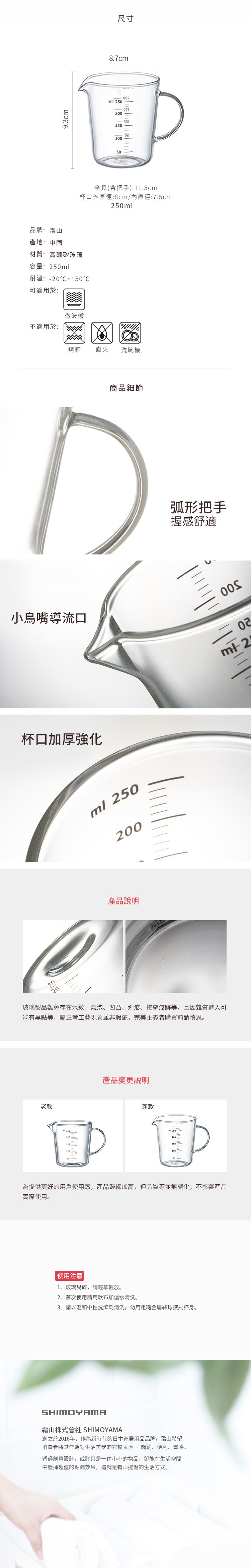 尺寸:[主體]直徑8.7×高9.3cm、[全長]11.5cm(含把手) 材質:高硼矽玻璃 耐溫:-20℃~150℃ 容量:250ml 產地:中國 適用於:微波爐 不適用於:烤箱、直火、洗碗機 ※尺寸皆為人工測量,誤差±0.2cm屬正常範圍