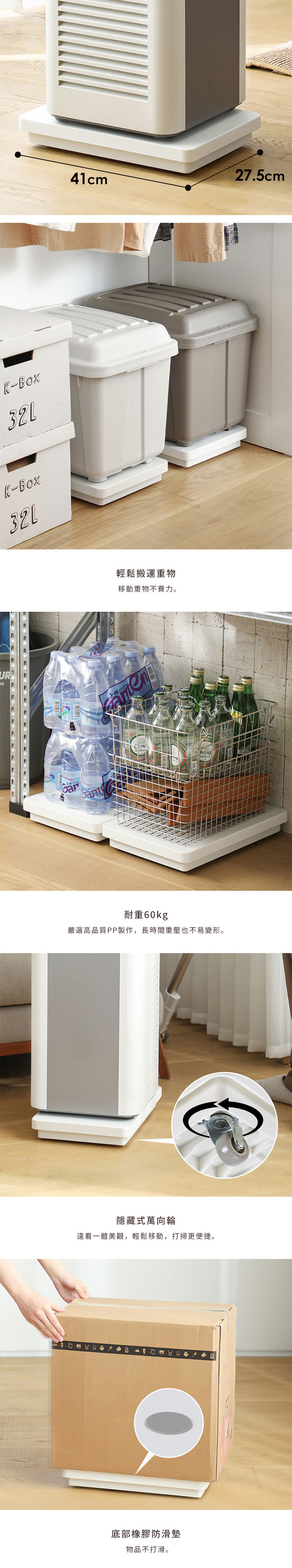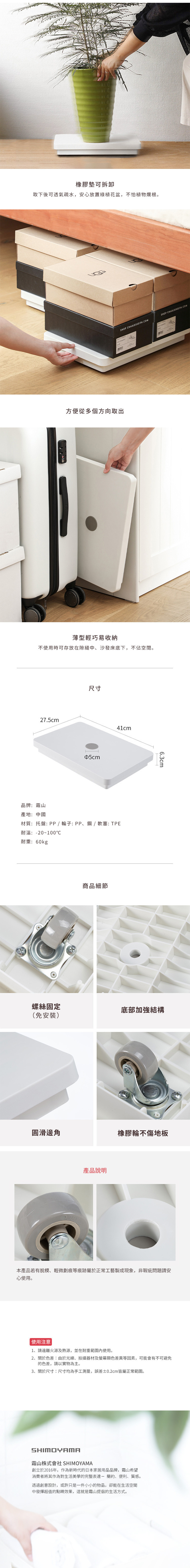 尺寸:長41×寬27.5×高6.3cm 材質:[托盤]PP、[輪子]PP、鋼、[軟塞]TPE 耐溫:-20~100℃ 耐重:60kg 產地:中國 ※尺寸皆為人工測量,誤差±0.2cm屬正常範圍