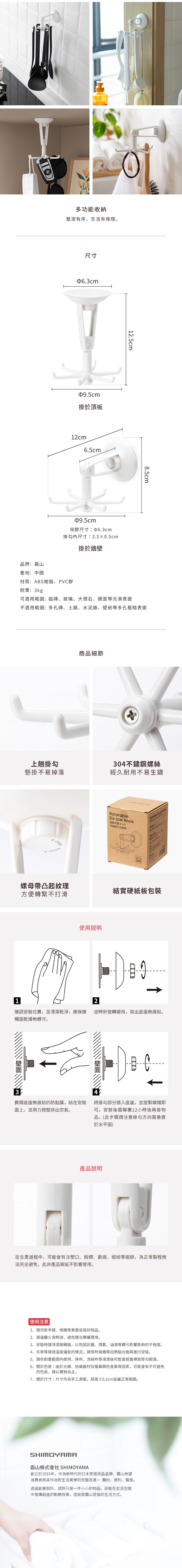 尺寸:[掛於頂板]直徑9.5×高12.5cm、[掛於牆壁]寬9.5×深12×高8.5cm 材質: ABS樹脂、PVC膠 耐重:3kg 產地:中國 ※尺寸皆為人工測量,誤差±0.2cm屬正常範圍。