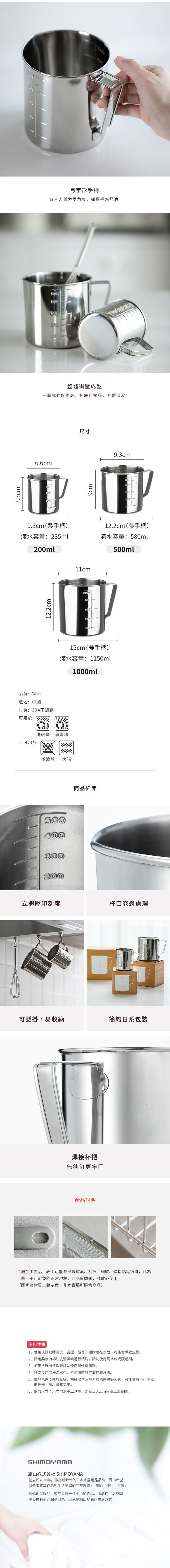 尺寸:直徑15×高12.2cm(含手柄) 材質:304不鏽鋼 容量:1000ml、[滿水]1150ml 適用於:洗碗機、消毒櫃 不適用於:微波爐、烤箱 產地:中國 ※尺寸皆為人工測量,誤差±0.2cm屬正常範圍。