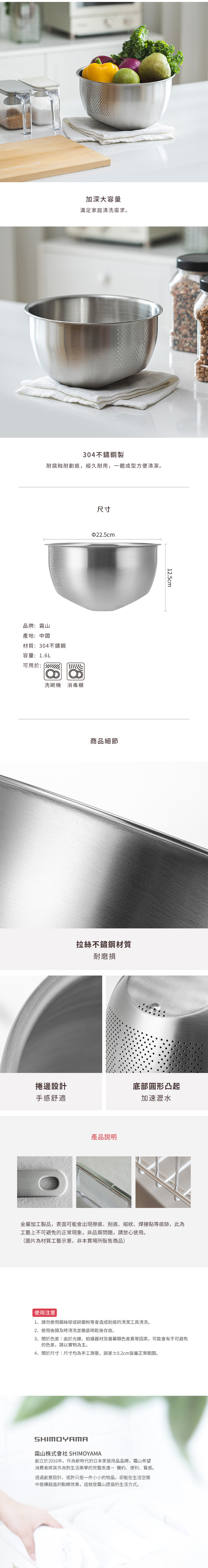 尺寸:直徑22.5×高12.5cm 材質:304不鏽鋼 容量:1.6L 適用於:洗碗機、消毒櫃 產地:中國 ※尺寸皆為人工測量,誤差±0.2cm屬正常範圍。