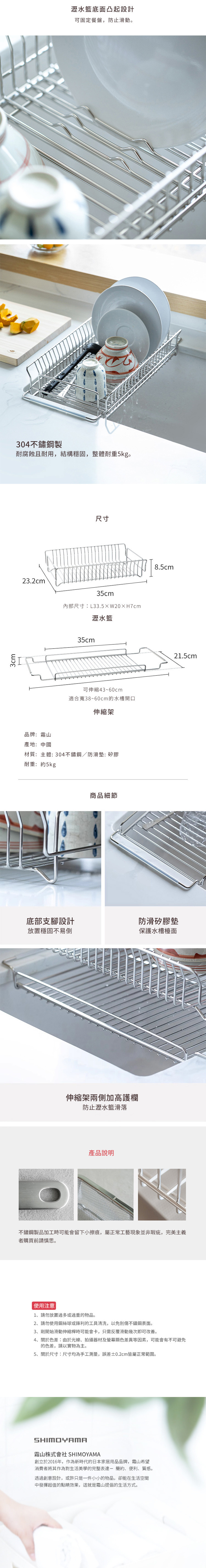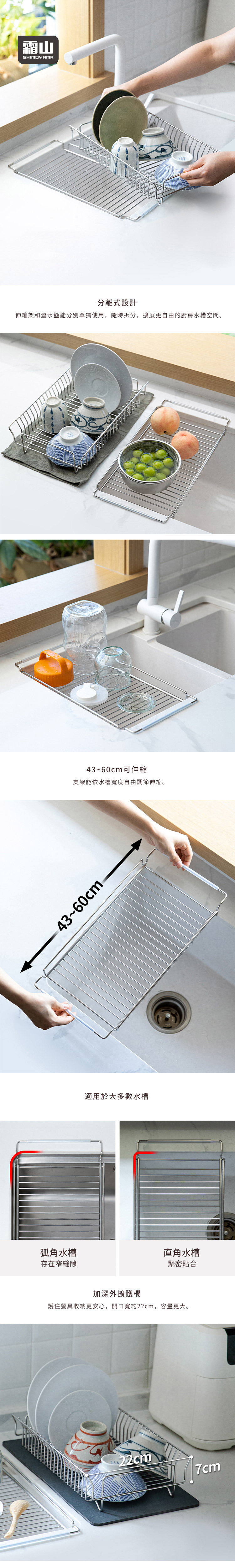 尺寸:[瀝水籃]長35×寬23.2×高8.5cm、[內尺寸]長33.5×寬20×高7cm、[伸縮架]長43~60×寬21.5×高3cm(適合寬38~60cm的水槽開口)