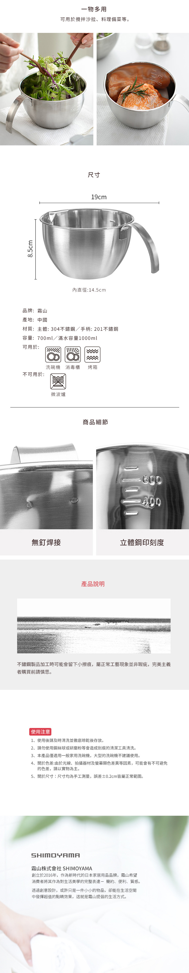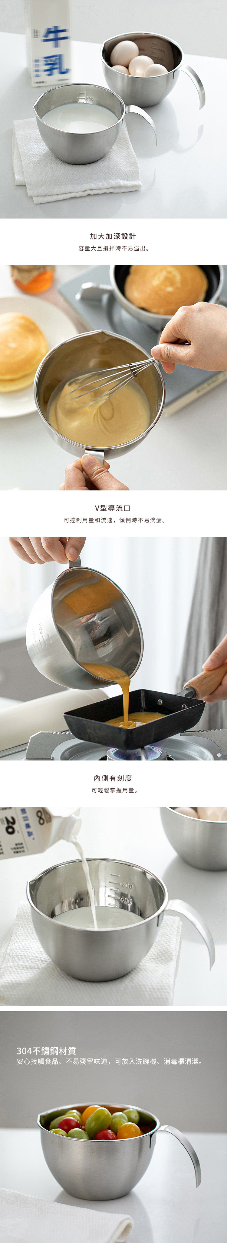 尺寸:長(含手柄)19×直徑14.5×高8.5cm 材質:[主體]304不鏽鋼、[手柄]201不鏽鋼 容量:刻度容量700ml、滿水容量1000ml 適用於:洗碗機、消毒櫃、烤箱 不適用於:微波爐 產地:中國 ※尺寸皆為人工測量,誤差±0.2cm屬正常範圍。