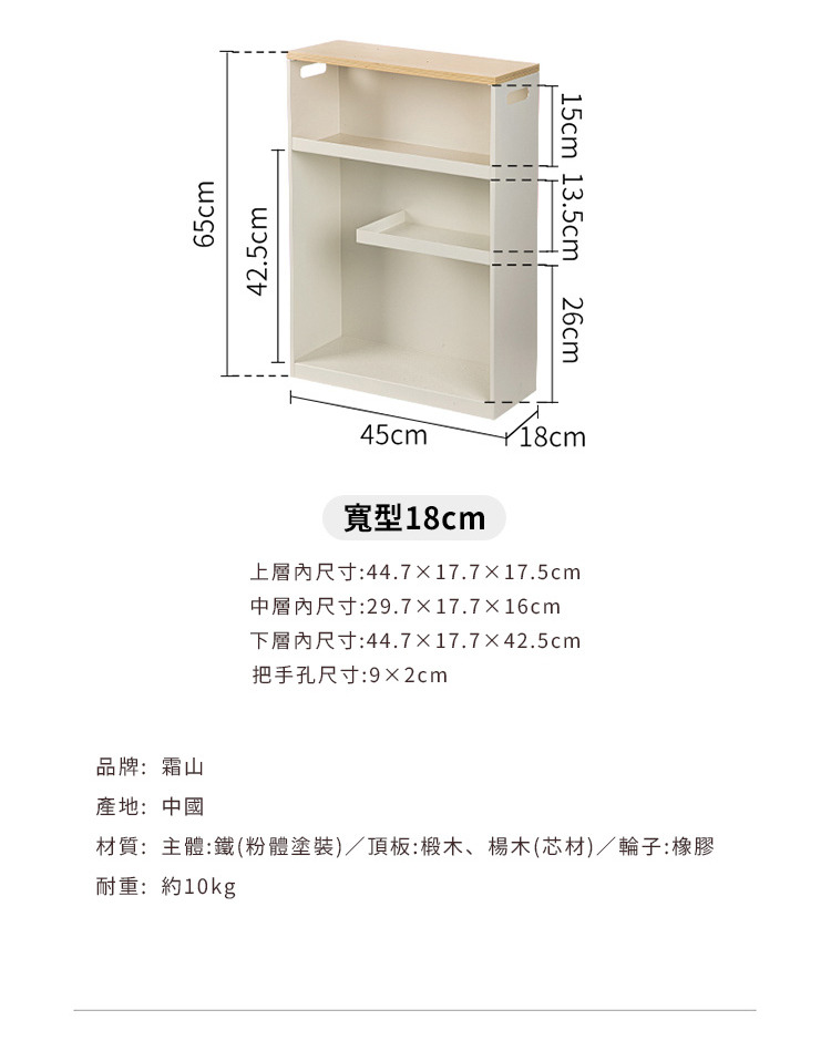 尺寸:寬45×深18×高65cm 材質:[主體]鐵(粉體塗裝)、[頂板]椴木、楊木(芯材)、[輪子]橡膠 耐重:約10kg 產地:中國 ※尺寸皆為人工測量,誤差±0.2cm屬正常範圍