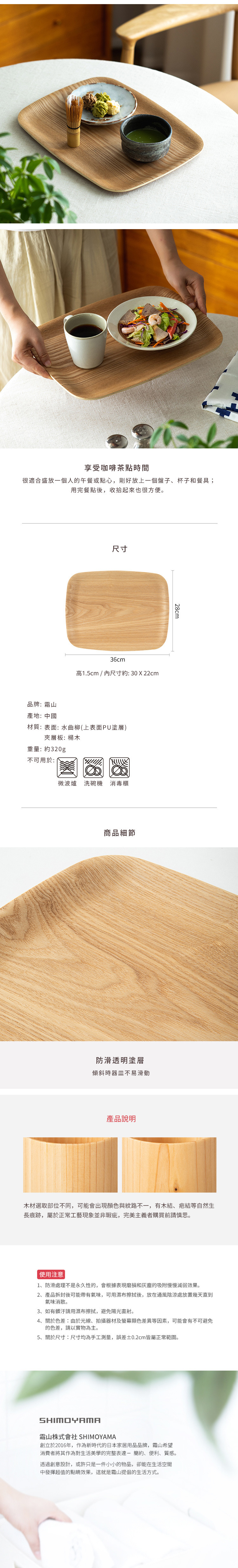 尺寸:長36×寬28×高1.5cm、[內尺寸]約長30×寬22cm 材質:[表面]水曲柳(上表面PU塗層)、[夾層板]楊木 重量:(約)320g 不適用於:微波爐、洗碗機、消毒櫃 產地:中國 ※尺寸皆為人工測量,誤差±0.2cm屬正常範圍。