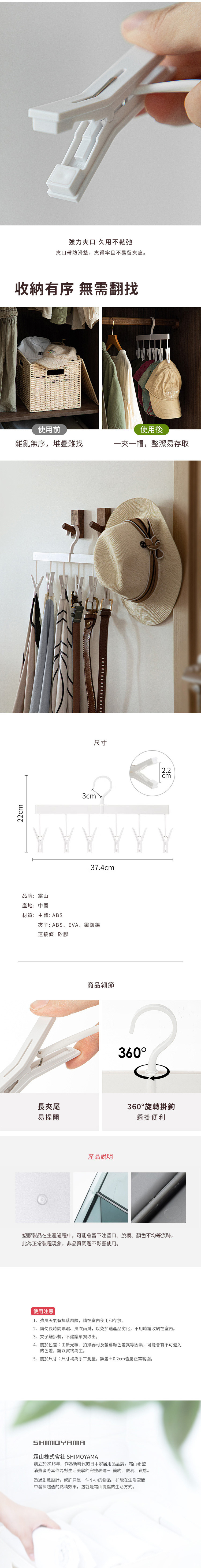 尺寸:[主體]寬37.4×高22cm、夾口寬2.2cm 材質:[主體]ABS、[夾子]ABS、EVA、鐵鍍鎳、[連接條]矽膠 產地:中國 ※尺寸皆為人工測量,誤差±0.2cm屬正常範圍。