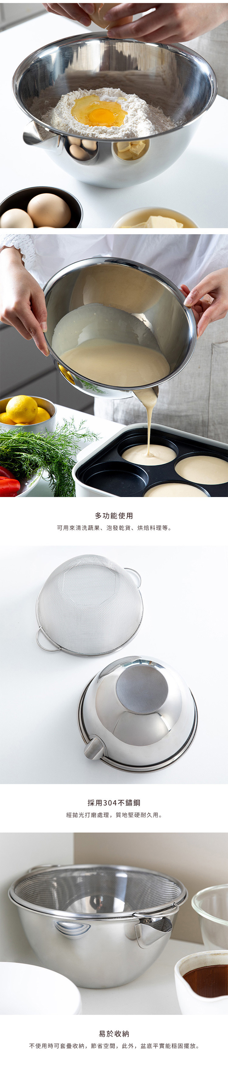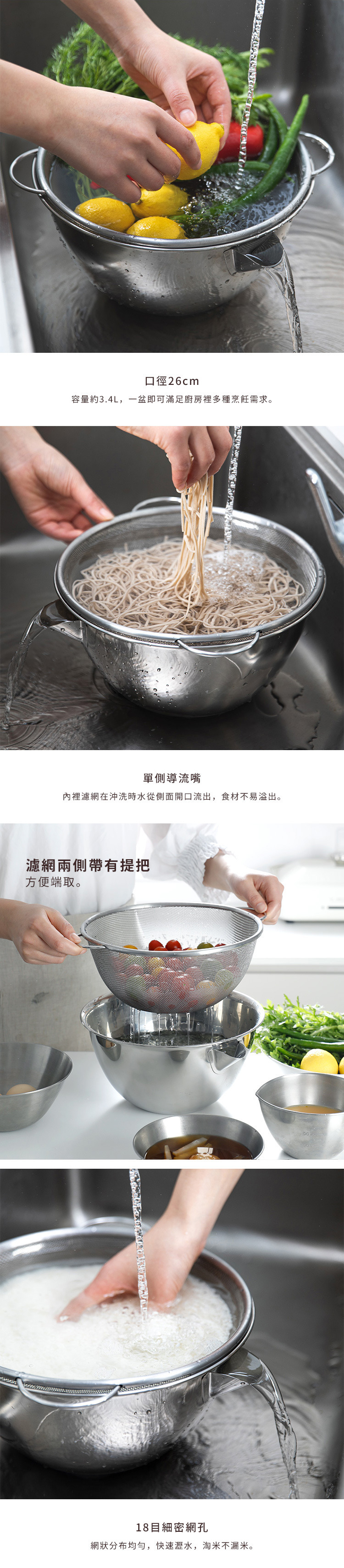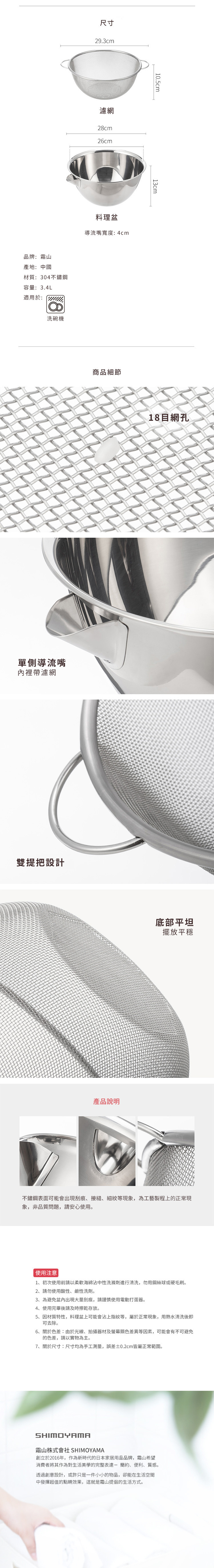 尺寸:[料理盆]直徑28×高13cm、[濾網]直徑29.3×高10.5cm(直徑包含把手)、[導流嘴]寬4cm 材質:304不鏽鋼 容量:3.4L 適用於:洗碗機 產地:中國 ※尺寸皆為人工測量,誤差±0.2cm屬正常範圍。