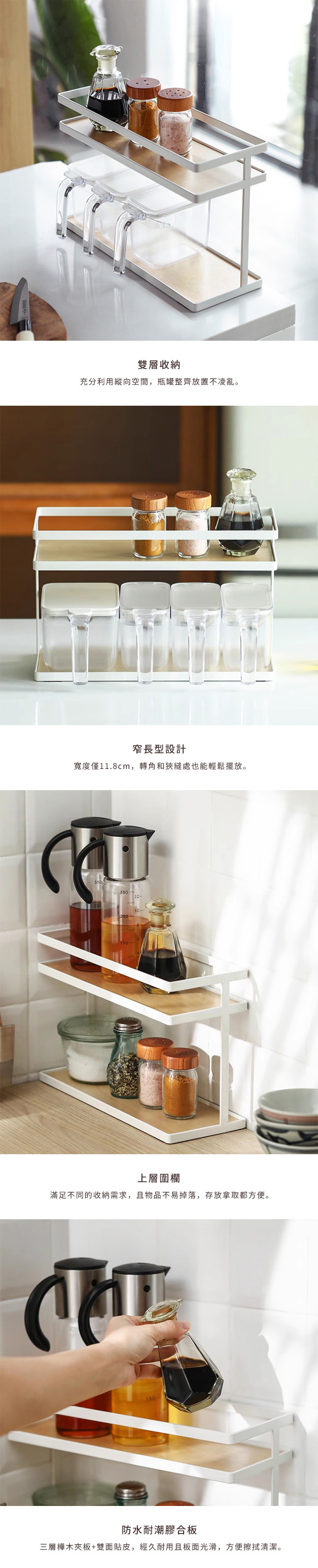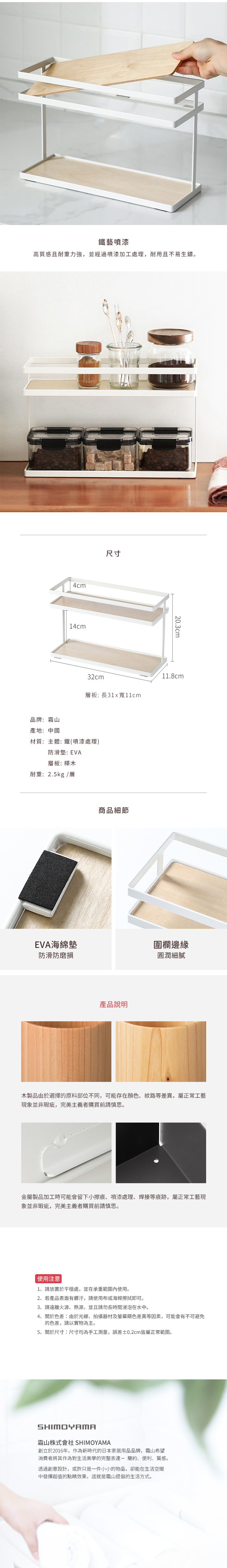 尺寸:長32×寬11.8×高20.3cm、[層板]長31×寬11cm 材質:[主體]鐵(噴漆處理)、[防滑墊]EVA、[層板]樺木 耐重:2.5kg/層 產地:中國 ※尺寸皆為人工測量,誤差±0.2cm屬正常範圍。