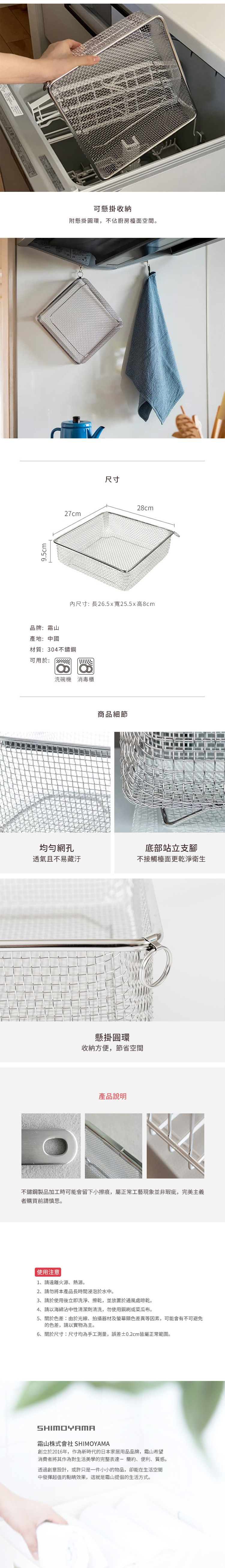 尺寸:長28×寬27×高9.5cm、[內尺寸]長26.5×寬25.5×高8cm 材質:304不鏽鋼 適用於:洗碗機、消毒櫃 產地:中國 ※尺寸皆為人工測量,誤差±0.2cm屬正常範圍。
