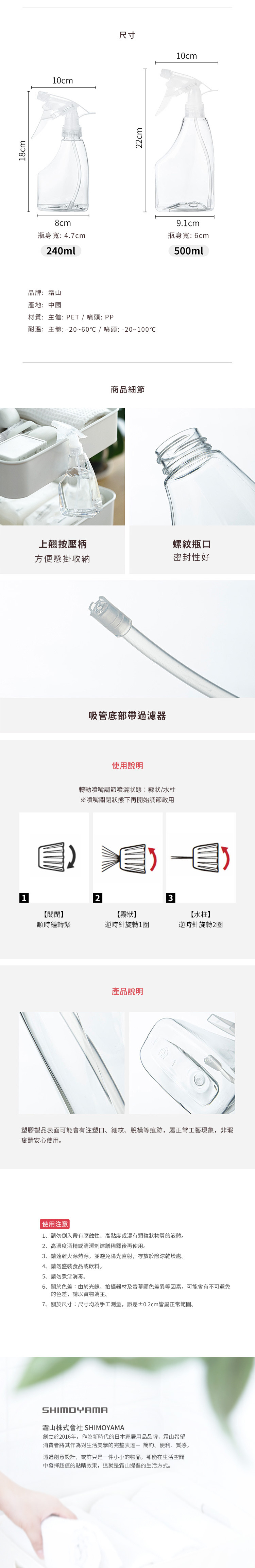 尺寸:長10×寬6×高22cm 材質:[主體]PET、[噴頭]PP 耐溫:[主體] -20~60℃ 、[噴頭] -20~100℃ 產地:中國 ※尺寸皆為人工測量,誤差±0.2cm屬正常範圍。
